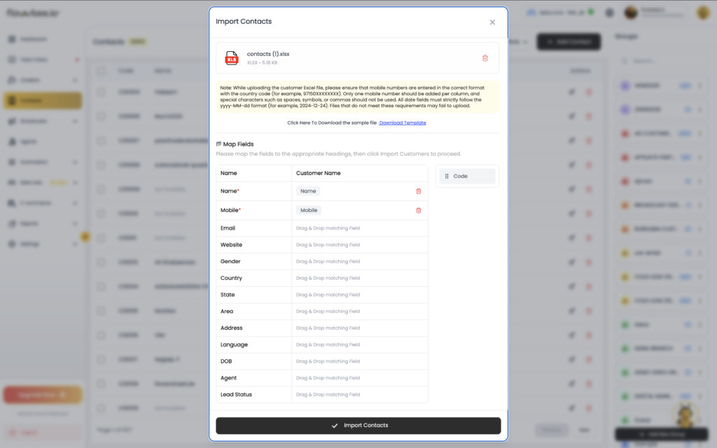 - The file must include mandatory columns: Name and Mobile Number.