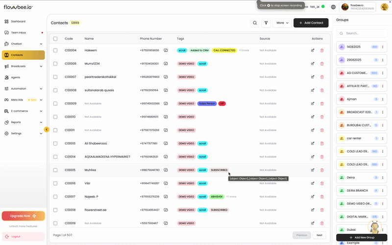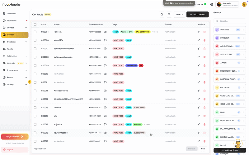 When a customer starts a conversation with your WhatsApp number, Flowbee automatically saves their mobile number in your Contacts. This ensures that every new interaction is captured without any manual effort.