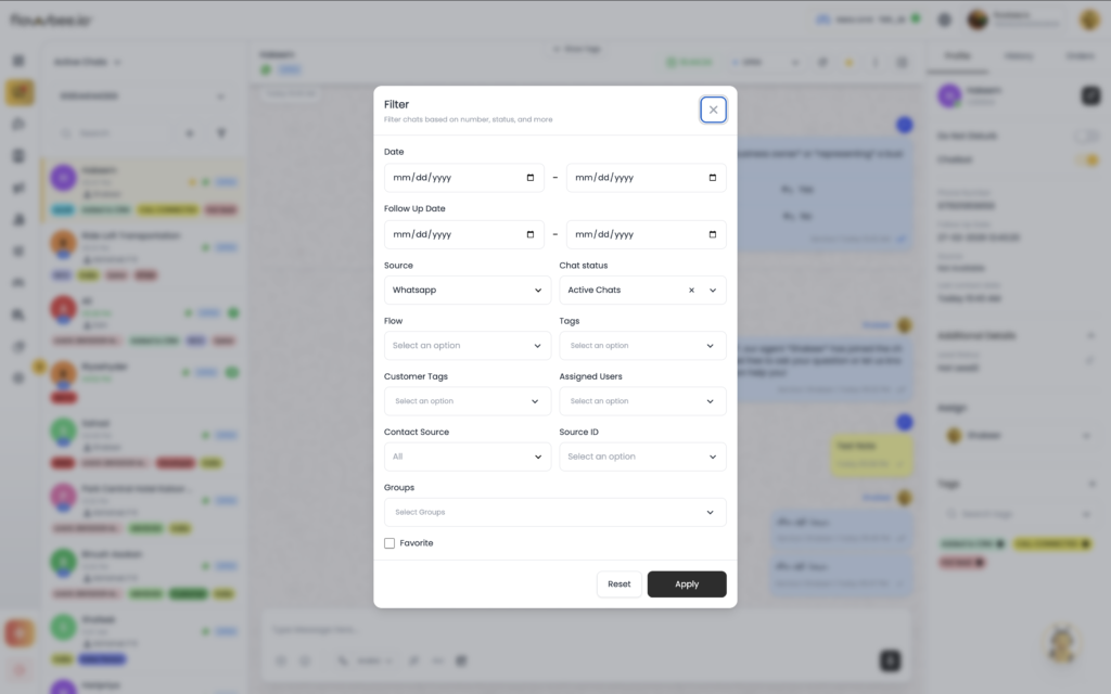 Filter chats using tags to quickly identify specific groups such as new leads, follow-ups, or closed conversations. This helps in better organization and targeted actions.